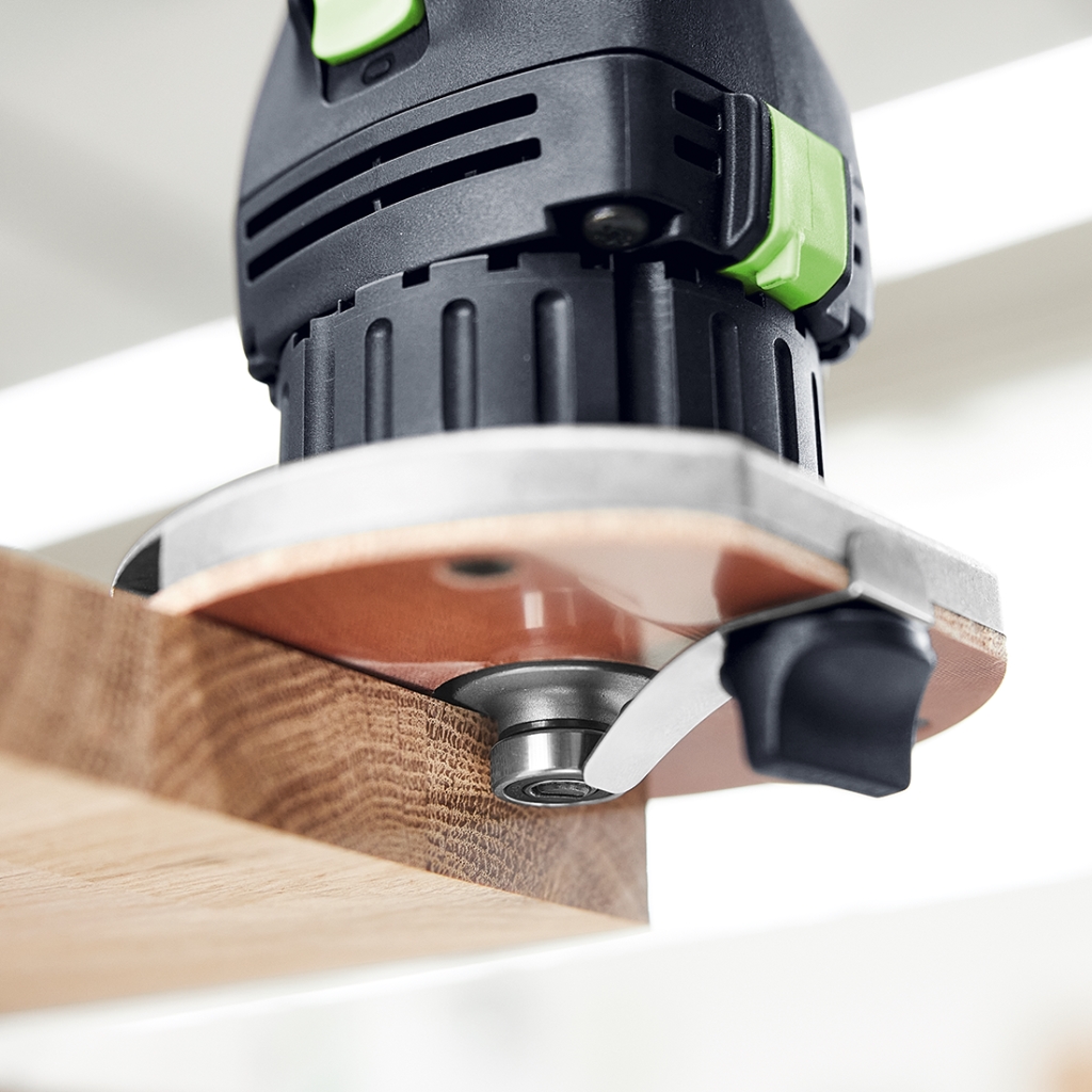 Flächenbündige Kugellagerbefestigung am Fräser sorgt für geringe Bauhöhe von nur 12 mm und ermöglicht das Fräsen im Falz oder vom Plattenstapel