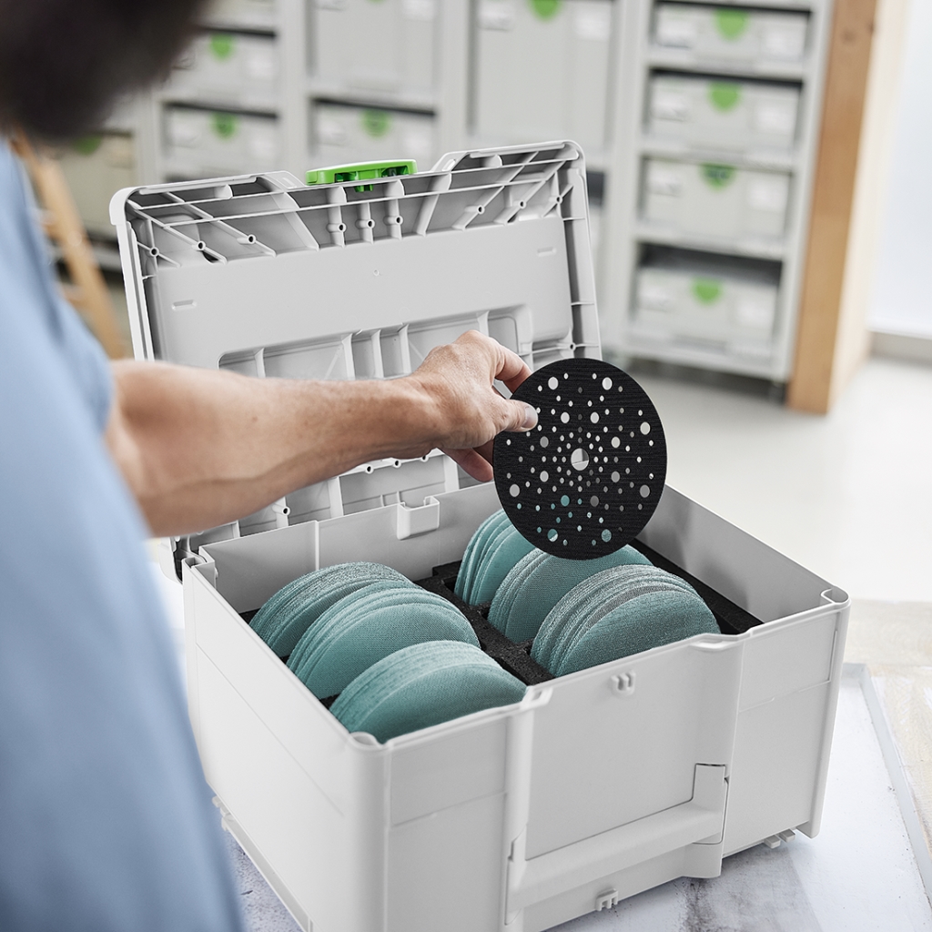 Systainer schützt Schleifmittel vor widrigen Einflüssen wie Staub, Spritzwasser, Knicken etc.und ermöglicht einfachen Transport